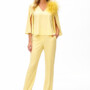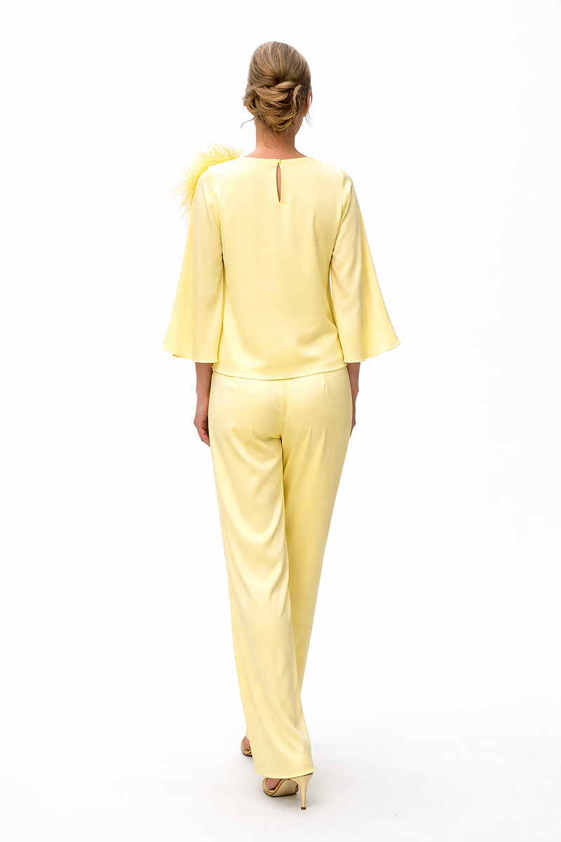 Chic and contemporary, this elegant yellow two-piece outfit is designed for modern occasion dressing. The flowing top features a flattering V-neckline, cape-style sleeves and a striking feather detail on the shoulder for a couture-inspired finish. Paired with tailored trousers, this set offers effortless sophistication and comfort. Perfect for weddings, special events and refined daytime occasions. – the yellow broche on the blouse is not included