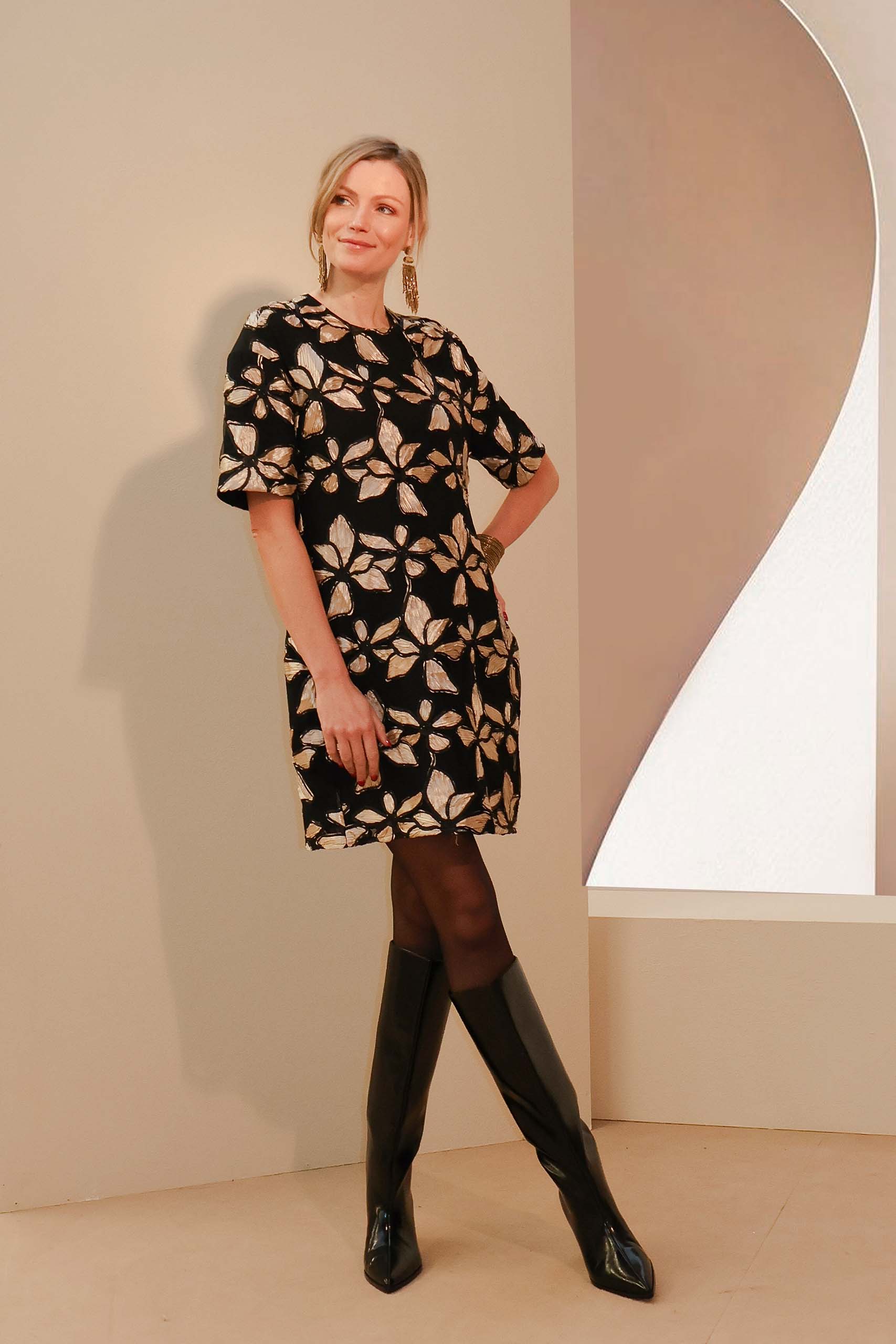 Raffaelli Casual Chique – Short, black and gold dress in a luxurious fabric with a floral print. The metallic gold sheen makes the dress an eye-catcher!